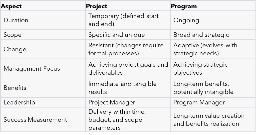 In the corporate setting, projects and programs serve different purposes and require different management approaches.