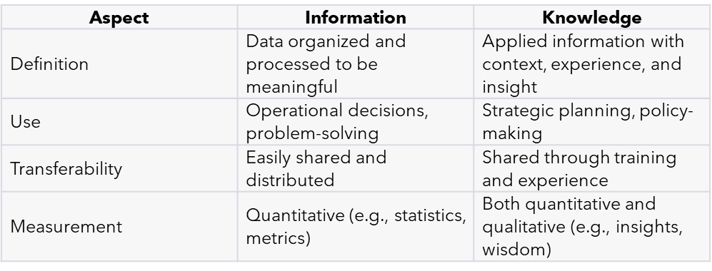 In essence, information and knowledge are two sides of the same coin. Information is the factual foundation — clear, tangible, and more immediately applicable. Knowledge is more nuanced, embodying the synthesis of information with professional intuition and expertise. In the corporate world, managing both effectively is crucial for sustaining operations and driving strategic growth.