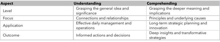 Understanding and comprehending are two sides of the cognitive coin in business thinking. While understanding provides a map to navigate through the immediate business landscape, comprehending offers the compass to chart a course toward future horizons. Leaders who cultivate both are better equipped to steer their organizations through complex challenges and dynamic market conditions, ensuring not just survival but sustainable growth and innovation.